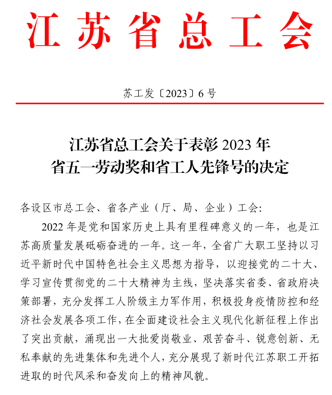 427日,江苏省总工会下发《关于表彰2023年省五一劳动奖和省工人先锋号的决定》(苏工发2023﹞6号)文件,对过去一年爱岗敬业、艰苦奋斗、锐意创新、无私奉献的先进集体和先进个人进行表彰。我校高清av 被评为“江苏省工人先锋号”。