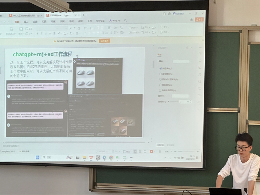 无锡卓尔谟工业设计中心负责人刘仁博和向阳老师先后向学生分享了精彩的内容。向阳老师首先向大家介绍了主流AI应用,并展示了AI参与工业设计的实际案例,分析了当下多款AI应用的特点以及在表现产品设计效果方面的优劣势,详细讲解了Deepseek, Midjuorney, stable Diffusion 从设计前期调研到设计方案推演,直至最终效果展示以及CMF设计的全流程。讲座第二阶段,刘仁博老师从社会发展,企业对人才能力需求,工业设计专业学生职业规划以及考研升学等方面进行了内容分享,该部分内容引起大三学生的高度关注。刘仁博老师重点强调了企业对AI运用能力的要求,并在学生的热情要求下对江浙沪热门考研高校的情况进行了深入剖析,为学生考研升学指明了方向。